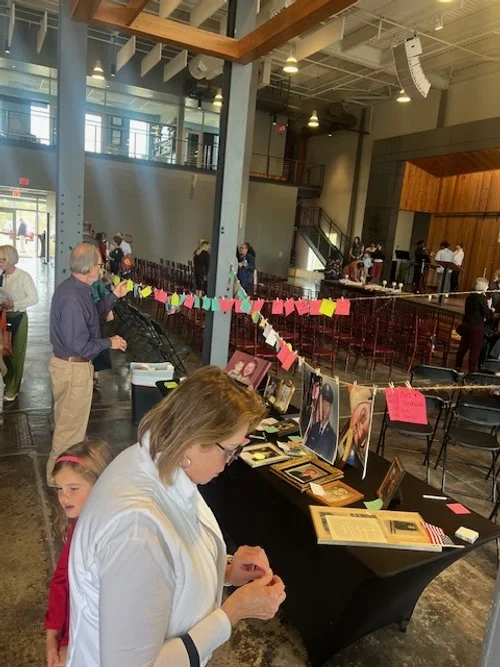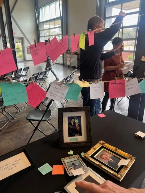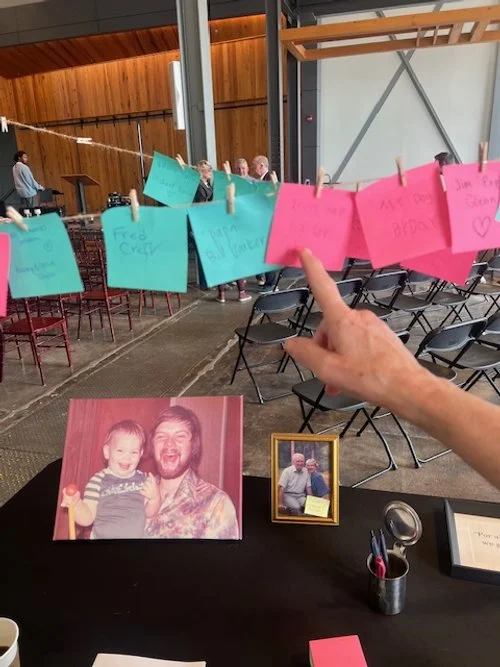 Bring a framed or unframed photo and add their image to the table under the smoke stacks before service. You can write their name on a sticky note and attach it to the strings if you don’t want to share a photo.